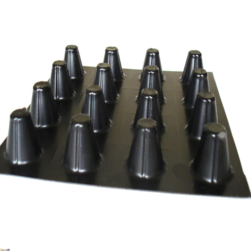 塑料排水板分卷材及片材二个系列,造型上采用特殊工艺将塑料板材压出封闭凸起的柱状壳体,形成凹凸状膜,壳连续,具有立体空间和一定支撑高度,边沿加工生产时热粘上丁基橡胶条,壳顶